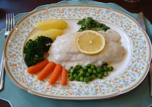 fish for Dolly . Before cooking, remove it, leave at room temperature until dissolved. And rinse thoroughly. The drain and dry. Then sprinkle with salt - ground pepper, mix them around a little piece of fish. Cold water entering into the incubator for half an hour. Then steamed for about 10 minutes, then boil until spinach is cool enough for beans, sweet potatoes, carrots, Brock choline until cooked (boiled vegetables to the water drop by drop, with a little salt. In order to maintain a green vegetable), when to eat, thus bringing to a boil then add the spinach dish. And then overlaid with Cheddar Cheese, steamed fish is cooked and put it on. Bake it in the microwave for 3 minutes to melt cheese. Since then topped with white wine served on pastafish and sprinkle the Valley. Chopped colorful. Search around a plate with cooked vegetables. The bread and butter as a side. With white wine and eaten with liquor. This is a delicious style.